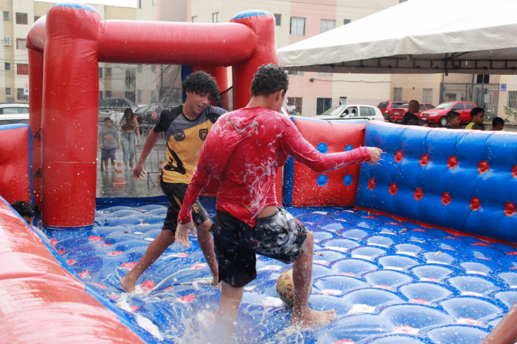 - Brinquedos infláveis, cama elástica, tobogã e touro mecânico;