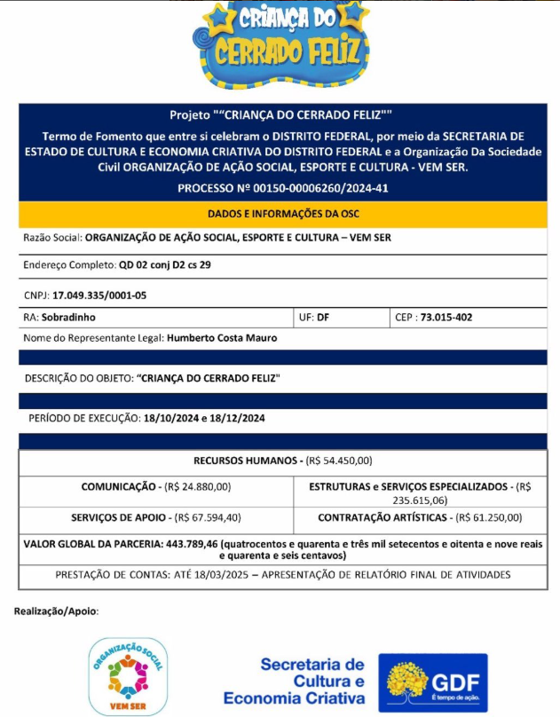 O projeto “Criança do Cerrado Feliz” teve como objetivo promover cultura, lazer e inclusão social por meio da realização de cinco grandes eventos comemorativos ao Dia das Crianças, voltados especialmente para crianças em situação de vulnerabilidade social no Distrito Federal.