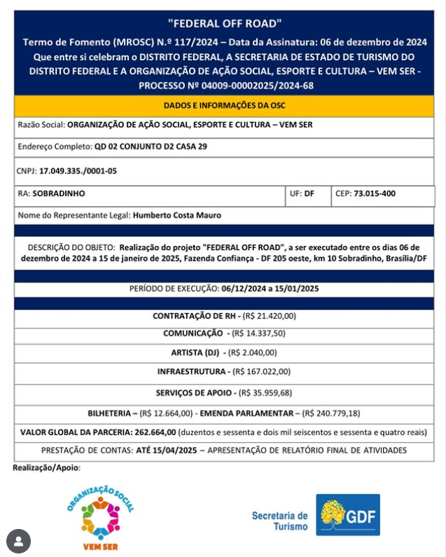 - Órgão Concedente: Secretaria de Estado de Turismo do Distrito Federal (SETUR/DF)